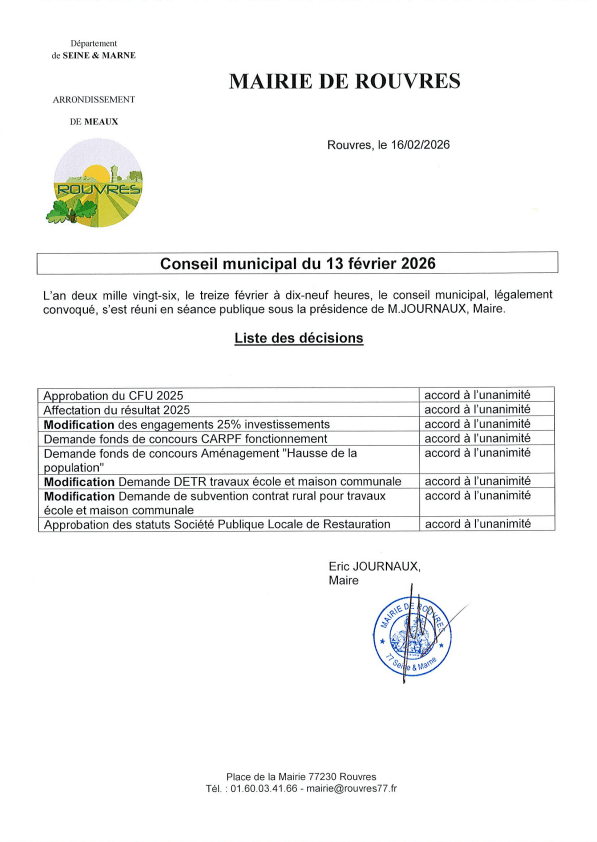 Procès verbaux du conseil municipal Compte-rendu du Conseil Municipal du 13 Février 2026 PV-CM-du-13-fevrier-2026 Décisions du Conseil Municipal du 13 Février 2026 Archives Conseil municipal – Comptes rendus 2025 Conseil municipal – Comptes rendus 2024 Conseil municipal – Comptes rendus 2023 Conseil municipal – Comptes rendus 2022 Conseil municipal – Comptes rendus 2021 Conseil municipal – Comptes rendus 2020